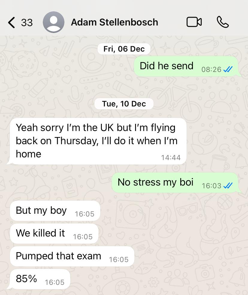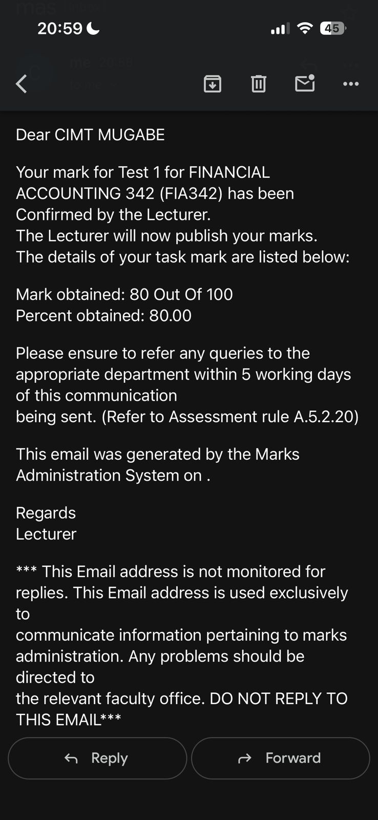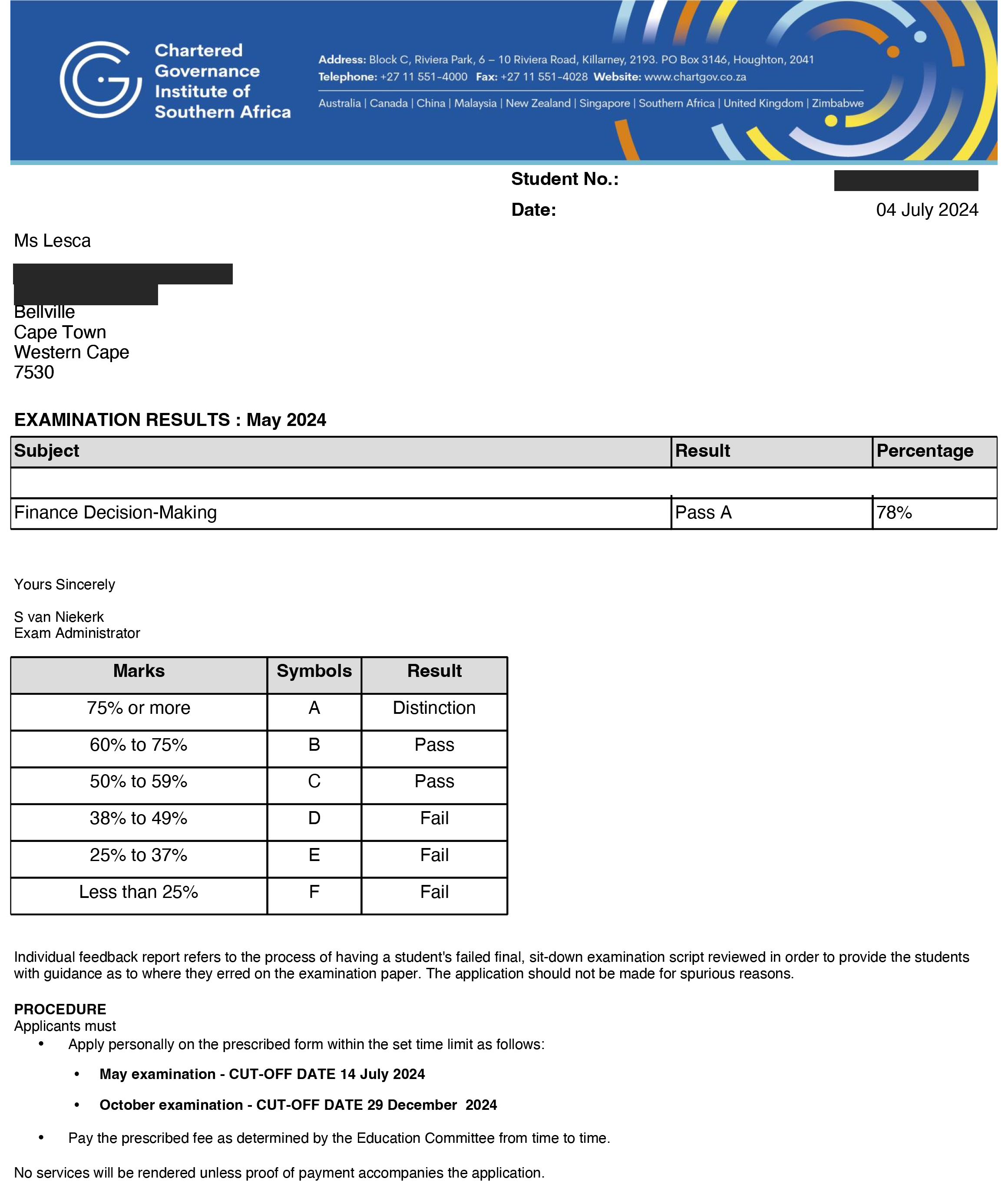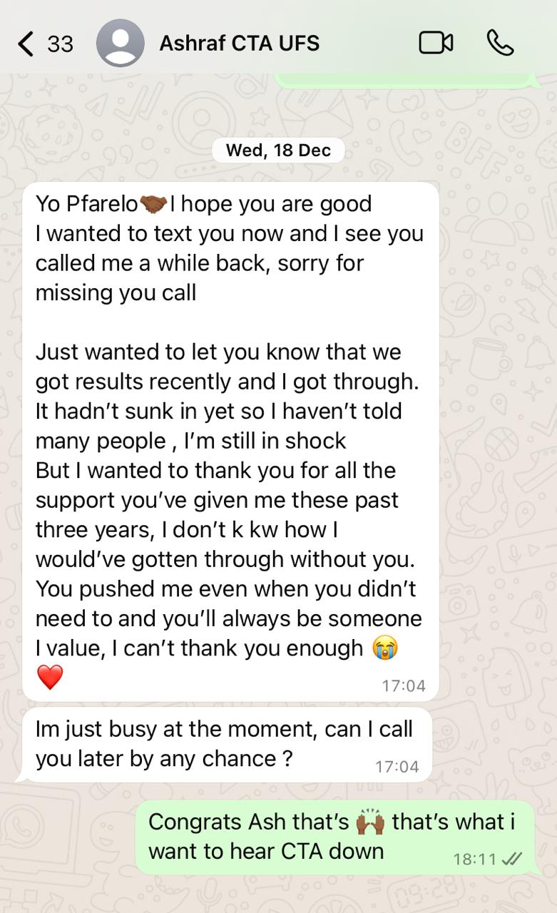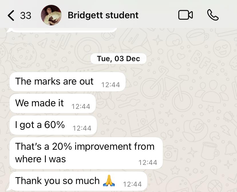 "Let's Walk really helped me out on my accounting supplementary exams, I got to the exam with 40% participation mark and lucky qualified for exam, I forced to study alone and unfortunately didn't make it in the first opportunity. I was helped by Let's Walk who managed to equip me with user friendly study material and explaining skills that make me understand the concepts more easily I managed to achieve more that enough marks after the tutoring serverces, I got 75% for the exam which made me qualify for the degree💯. I must say without the amazing tutoring services I received I wouldn't have been able to achieve those marks. Thank you Mr 🤝"